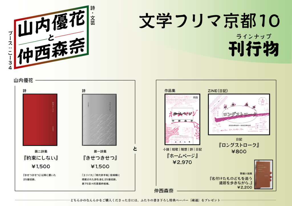 当日、山内優花は昨年上梓して早々H氏賞の最終候補に選出されていた第一詩集『きせつきせつ』と今年上梓した第二詩集『約束にしない』を、仲西森奈は新刊『ホームページ』とメールマガジン「My friend is not dead.」で配信し続けてきた日記の1年分をまとめたZINE『ロングストローク』、それから連作掌編小説シリーズ書籍版の第2巻『名付けたものどもを追う道筋を歩きながら、』をそれぞれ販売します。